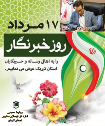 اینجانب ضمن گرامیداشت یاد و نام شهید خبرنگار، محمود صارمی، فرا رسیدن ۱۷ مرداد، روز خبرنگار این روز شکوهمند را به همه خبرنگاران، نویسندگان، روزنامه نگاران و صاحبان اندیشه و قلم بلاخص همکاران خودم در سازمان و اداره کل نوسازی مدارس استان، در عرصه اطلاع رسانی تبریک و تهنیت عرض می نمایم و مراتب سپاس و قدردانی خود را از حمایت های این قشر عزیز و زحمت کش که نقش عمده ای در انعکاس  اطلاعات  و  خدمات دهی همکاران این مجموعه در عرصه ساخت ،توسعه و تجهیز مدارس،  ابراز نموده و از خداوند سبحان برای ایشان در انجام رسالت حساس و خطیر تنویر افکار عمومی توفیق روزافزون مسئلت دارم.