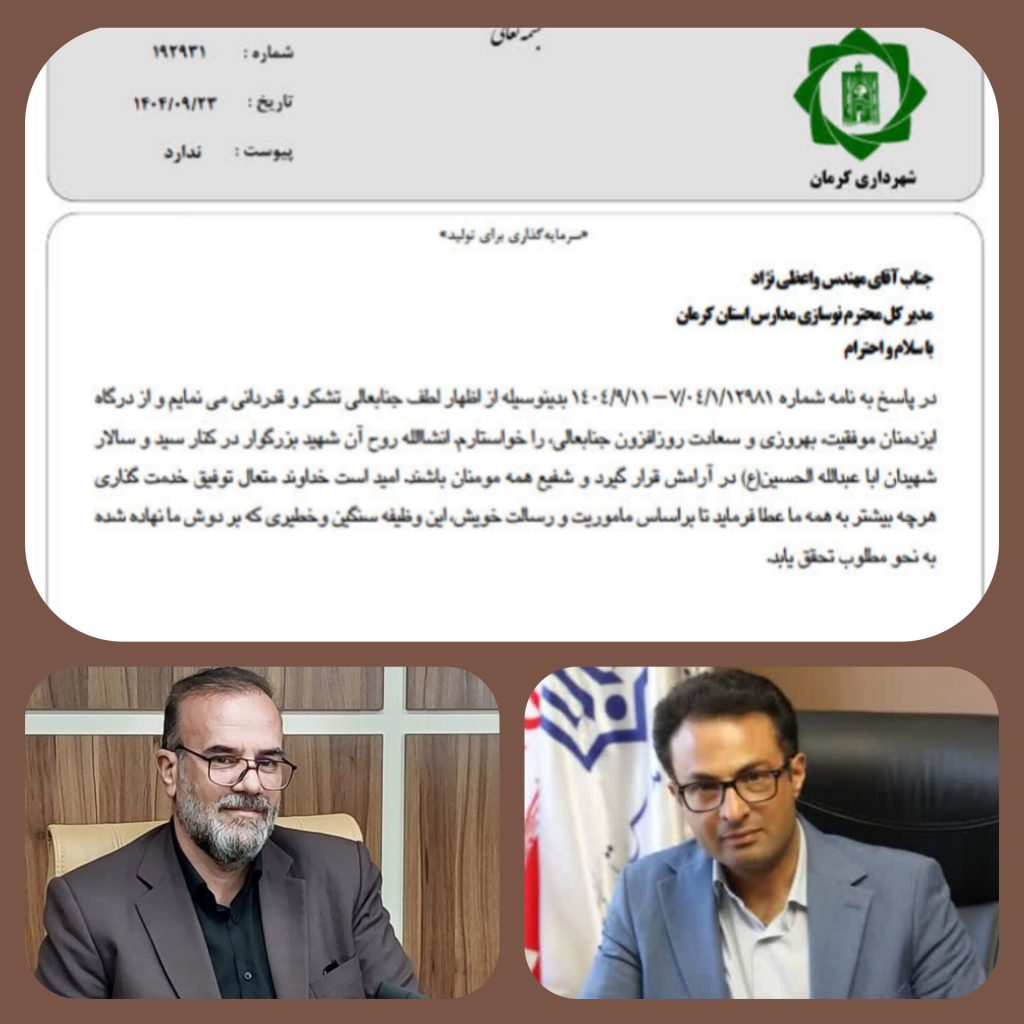مدیرکل نوسازی مدارس استان کرمان،از جنابعالی، بابت ارسال پیام تسلیت و ابراز همدردی در پی شهادت آتشنشان شهید محسن میرشکار